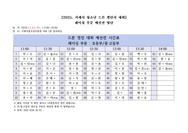 페이지 정보 작성자 관리자 쪽지보내기 메일보내기 자기소개 아이디로 검색 전체게시물 쪽지보내기 메일보내기 자기소개 아이디로 검색 전체게시물 조회133회 작성일 25-10-31 10:38 본문 [2025.거제시 청소년 드론 챌린지 대회] 레이싱부문(초/중등) 예선전 안내1.일시: 2025. 11. 1.(토), 11시 ~ 15시2.장소: 거제시청소년수련관 지하1층 동아리실3.내용: 레이싱부문(초/중등) 예선전4.문의: 055-639-8175 ** 예선 시작 시간 10분 전에 도착하셔서 준비해 주세요^^ 목록