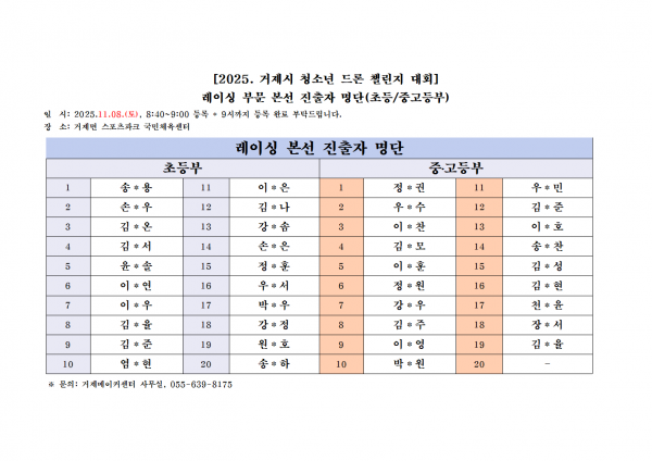 페이지 정보 작성자 관리자 쪽지보내기 메일보내기 자기소개 아이디로 검색 전체게시물 쪽지보내기 메일보내기 자기소개 아이디로 검색 전체게시물 조회137회 작성일 25-11-01 15:54 본문 [2025.거제시 청소년 드론 챌린지 대회] 레이싱부문(초/중등) 본선 진출자 안내1. 본선 진출을 진심으로 축하드립니다^^2. 본선일사: 11월 8일(토), 8시 20분 ~ 9시 * 9시까지 등록완료 바랍니다.3. 본선장소: 거제스포츠파크 국민체육센터 목록