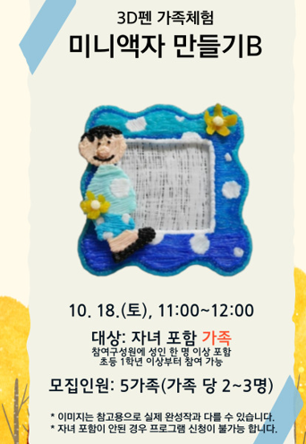 본문 프로그램 내용 < 이미지 클릭시 확대하여 볼 수 있습니다. > 가족체험-3D펜 가족체험B/미니액자 만들기 · 프로그램 일정 2025-10-18 ~ 2025-10-18 · 신청기간 2025-10-01 ~ 2025-10-16 · 교육시간 11:00~13:00 · 수강료 0 · 수강대상 초등 1학년 이상 자녀 포함 가족 · 수강인원 3 /5 · 대기인원 0 /5 · 강사 조소형/이재희 모집완료 교육내용 가족이 함께 예쁜 미니 액자를 3D펜으로 꾸며 보아요^^ 목록