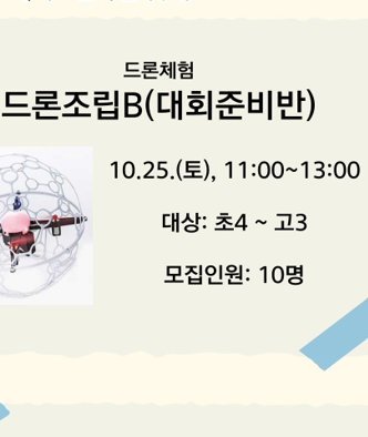 본문 프로그램 내용 < 이미지 클릭시 확대하여 볼 수 있습니다. > 드론 조립B반 · 프로그램 일정 2025-10-25 ~ 2025-10-25 · 신청기간 2025-10-01 ~ 2025-10-23 · 교육시간 11:00~13:00 · 수강료 0 · 수강대상 초등 4학년~고등 3학년 · 수강인원 0 /10 · 대기인원 0 /10 · 강사 신재경/김현숙 모집완료 교육내용 드론의 구조와 기능을 이해하고 분해 조립해 보아요. 드론 경진대회 도전!! 목록