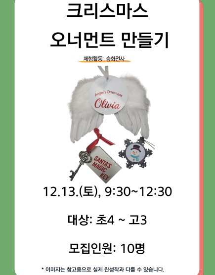 본문 프로그램 내용 < 이미지 클릭시 확대하여 볼 수 있습니다. > ArC취미-크리스마스 오너먼트 만들기 · 프로그램 일정 2025-12-13 ~ 2025-12-13 · 신청기간 2025-12-02 ~ 2025-12-11 · 교육시간 9:30~12:30 · 수강료 0 · 수강대상 초등 4학년~고등 3학년 · 수강인원 9 /10 · 대기인원 0 /10 · 강사 임지유/정미아 모집완료 교육내용 승화전사를 활용하여 크리스마스를 꾸며 줄 예쁜 오너먼트를 만들어 보아요^^ 목록