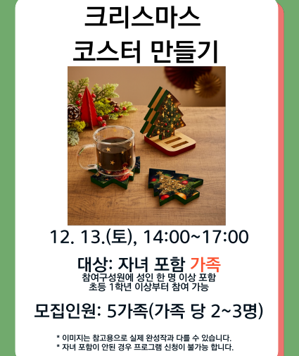 본문 프로그램 내용 < 이미지 클릭시 확대하여 볼 수 있습니다. > 가족체험-크리스마스 코스터 만들기 · 프로그램 일정 2025-12-13 ~ 2025-12-13 · 신청기간 2025-12-02 ~ 2025-12-11 · 교육시간 14:00~17:00 · 수강료 0 · 수강대상 자녀포함 가족당 2~3명 · 수강인원 5 /5 · 대기인원 8 /5 · 강사 백승욱/이재희 모집완료 교육내용 가족과 함께 할 크리마스를 아기자기한 코스터를 만들어 보아요^^ 목록